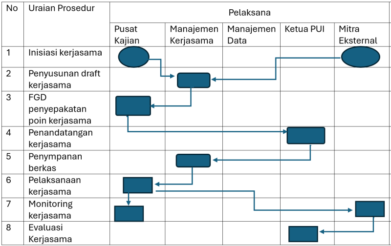 1. Inisiasi Kerja Sama: Proses diawali dengan inisiasi kerja sama yang dapat berasal dari Pusat Kajian maupun Mitra Eksternal. Pada tahap ini, ide atau kebutuhan kerja sama dikomunikasikan sebagai dasar penjajakan awal.